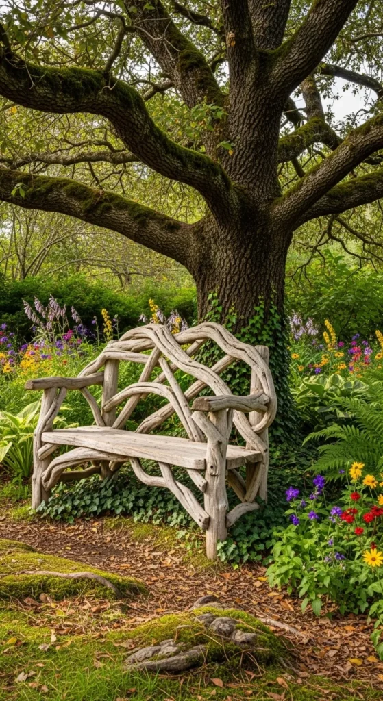 A driftwood garden bench offers a natural and rustic touch to your outdoor space. You can collect driftwood pieces from beaches or use reclaimed wood to craft a cozy, functional bench. This unique seating option provides a perfect spot to relax and enjoy your garden.
