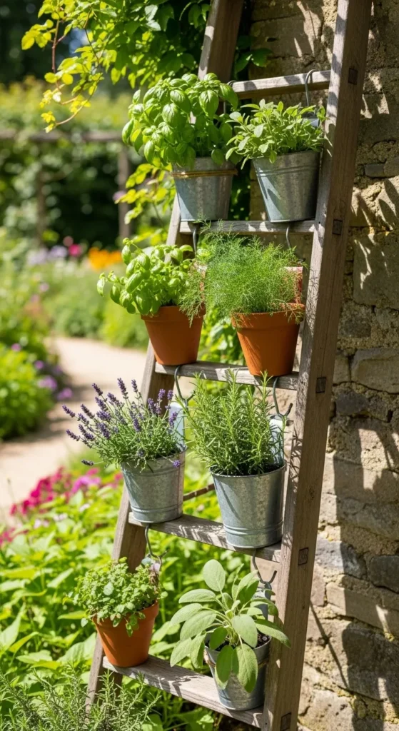 The garden ladder herb garden is both practical and charming. It makes use of vertical space, which is especially useful for small gardens, balconies, or patios. The rustic ladder design also adds a vintage feel to your garden, and the herbs’ fragrant aroma enhances your outdoor space.